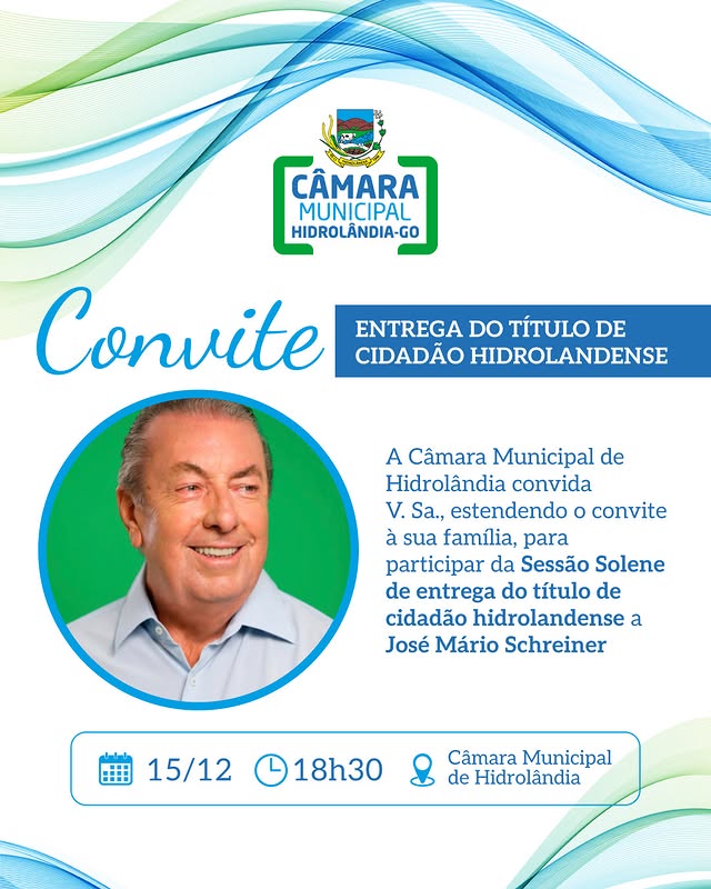 É com alegria que convidamos todos para a entrega do Título de Cidadão Hidrolandense ao Presidente do Sistema FAEG/SENAR e SEBRAE, vice-presidente do Sistema CNA, ex-deputado Federal, José Mário Schreiner.